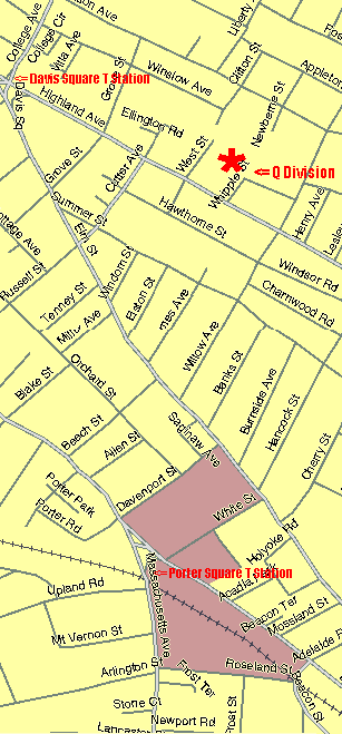 Take Rt. 93 South and get off at the Rt 16 E (toward Revere) exit. At end of ramp, Go right, across Mystic Ave, onto Harvard Street. Take Harvard Street all the way until you get to a big rotary. Go 4/5 of the way around onto Broadway. Take 4th right onto Willow Ave. Follow until major intersection at Highland Ave. Go right onto Highland. Take your first right onto Whipple St. Go left into parking lot. Entrance to Q Division is in the rear, in the corner off the parking lot.